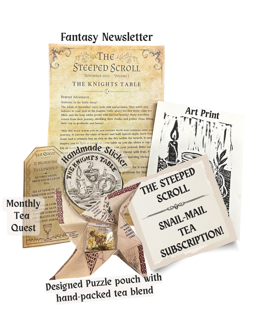 Each Month, a scroll arrives by post. Inside, you'll discover an exclusive handcrafted loose-leaf tea blend, measured for 1-2 cups accompanied by a hand-folded newsletter and a noble quest to embark on! As a token for accepting this journey, you will also receive a collectible keepsake such as a sticker + art print!
